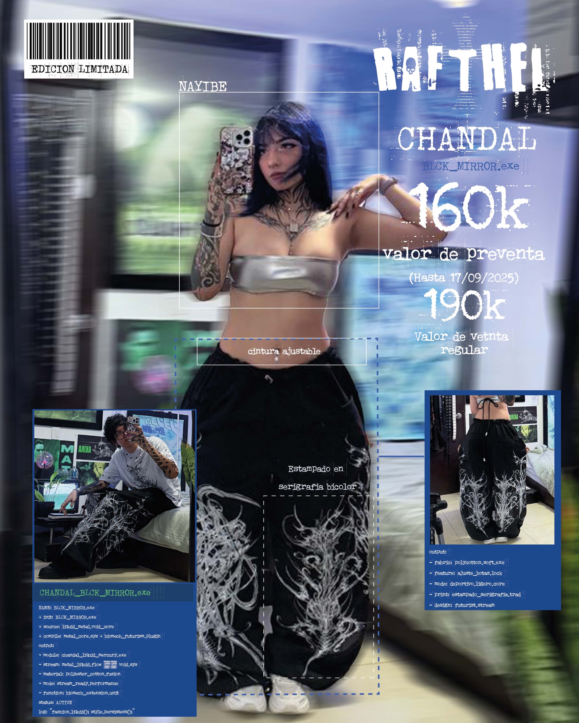 ⚡ CHÁNDAL 002 · BLACK_MIRROR.EXE de Rafthel es una prenda que fusiona el misticismo futurista con la fuerza del estilo urbano característico de la marca.