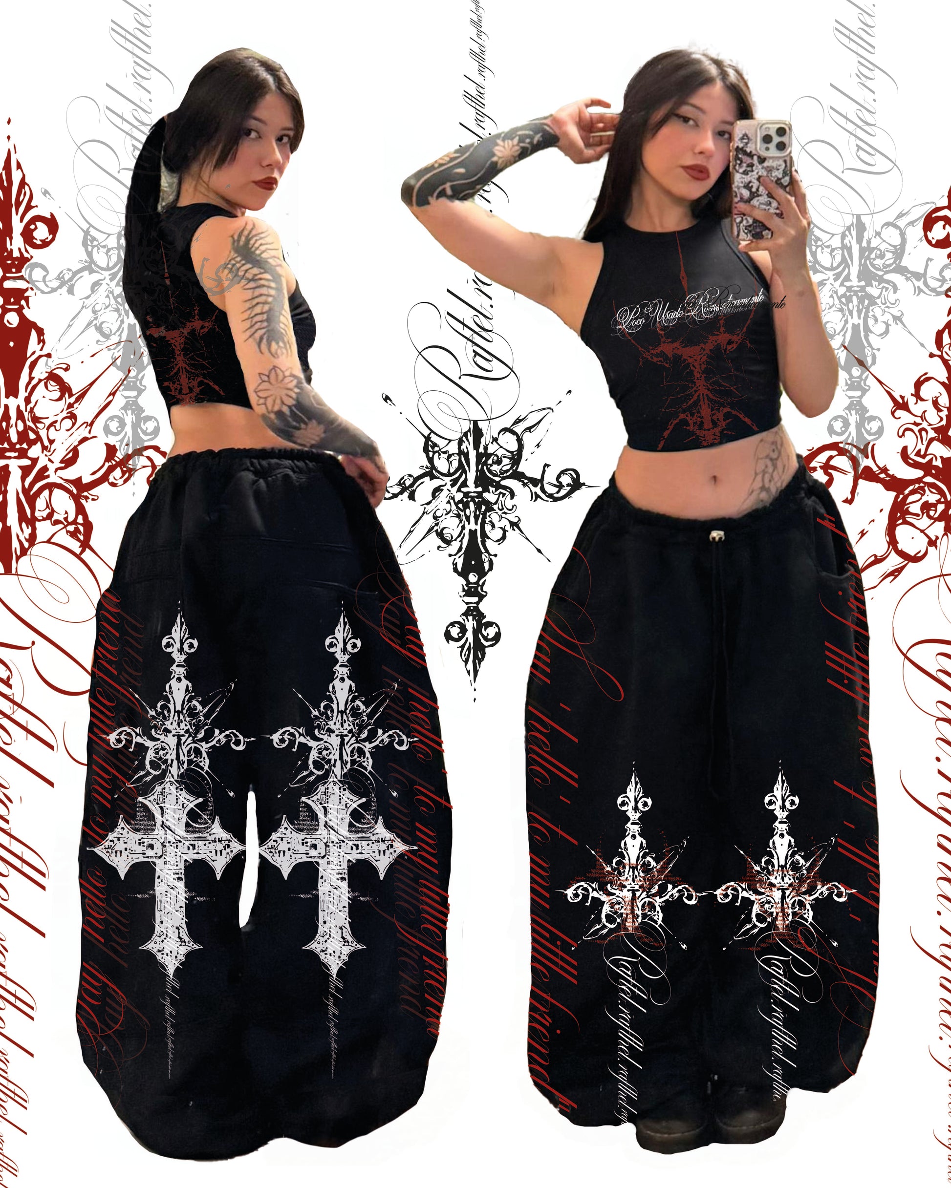 Su diseño presenta letras románticas en rojo y cruces góticas en blanco sobre un pantalón tipo chándal negro, creando un contraste poderoso que evoca el drama visual de una historia de amor y pérdida escrita con fuego y sombra.