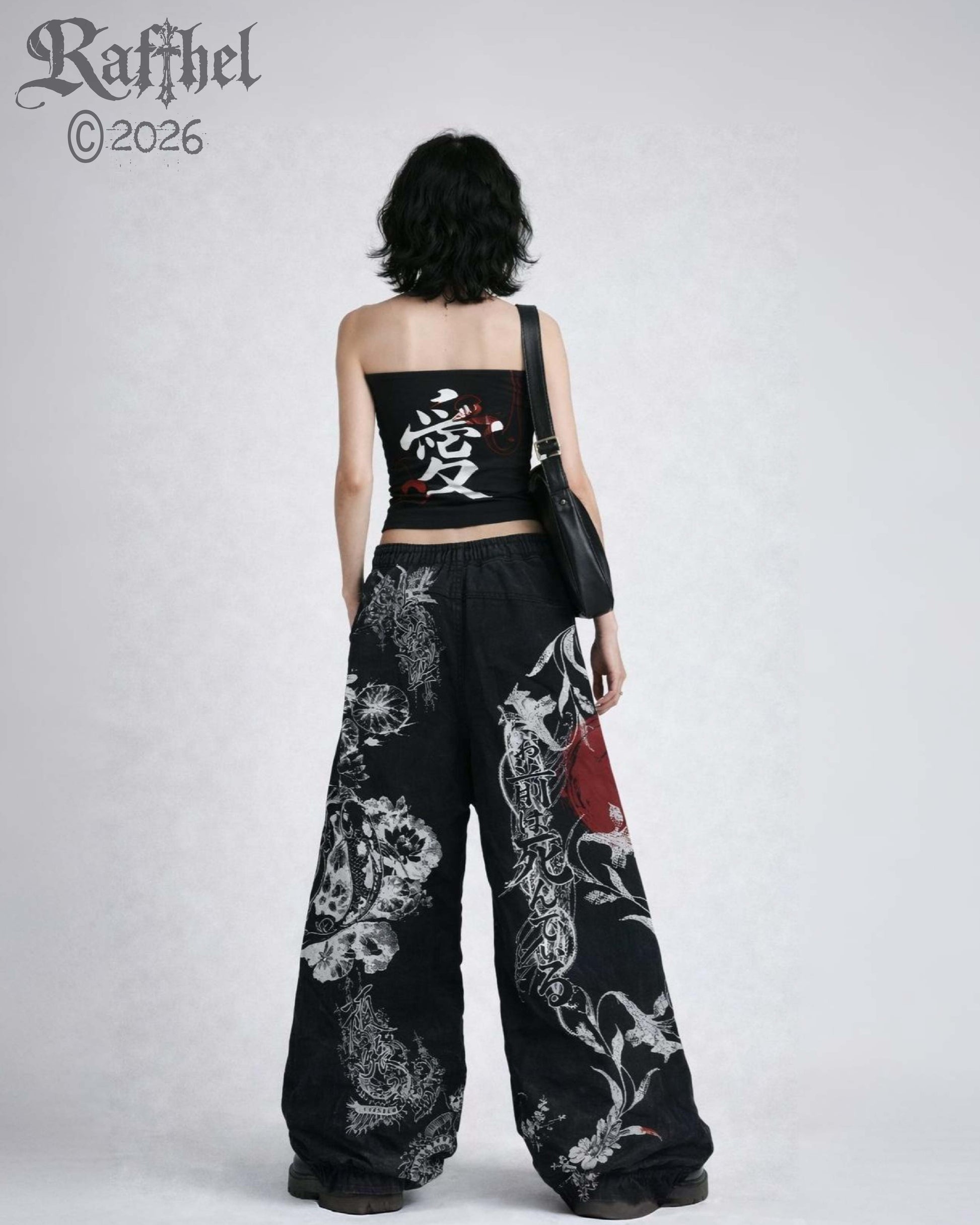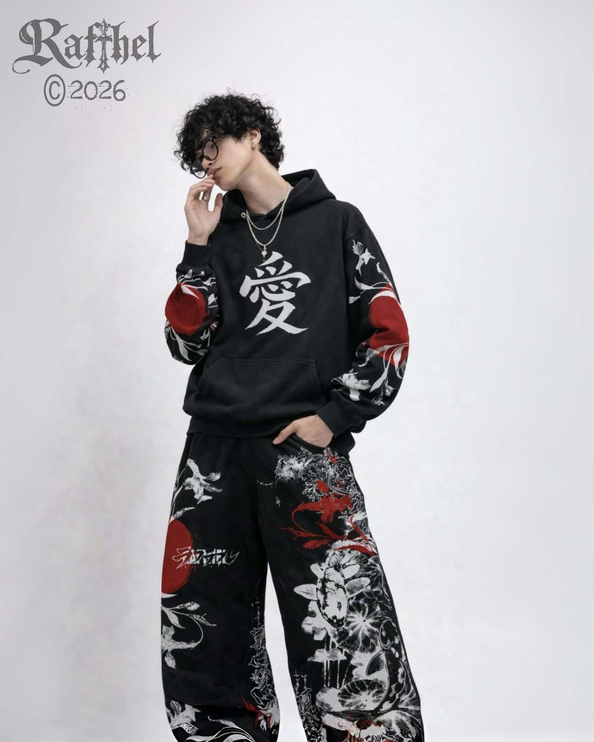 Chándal de bota ancha inspirado en el arte japonés. Su diseño integra flores tradicionales, el círculo rojo representativo de Japón y el pez koi como símbolo de fuerza y perseverancia.