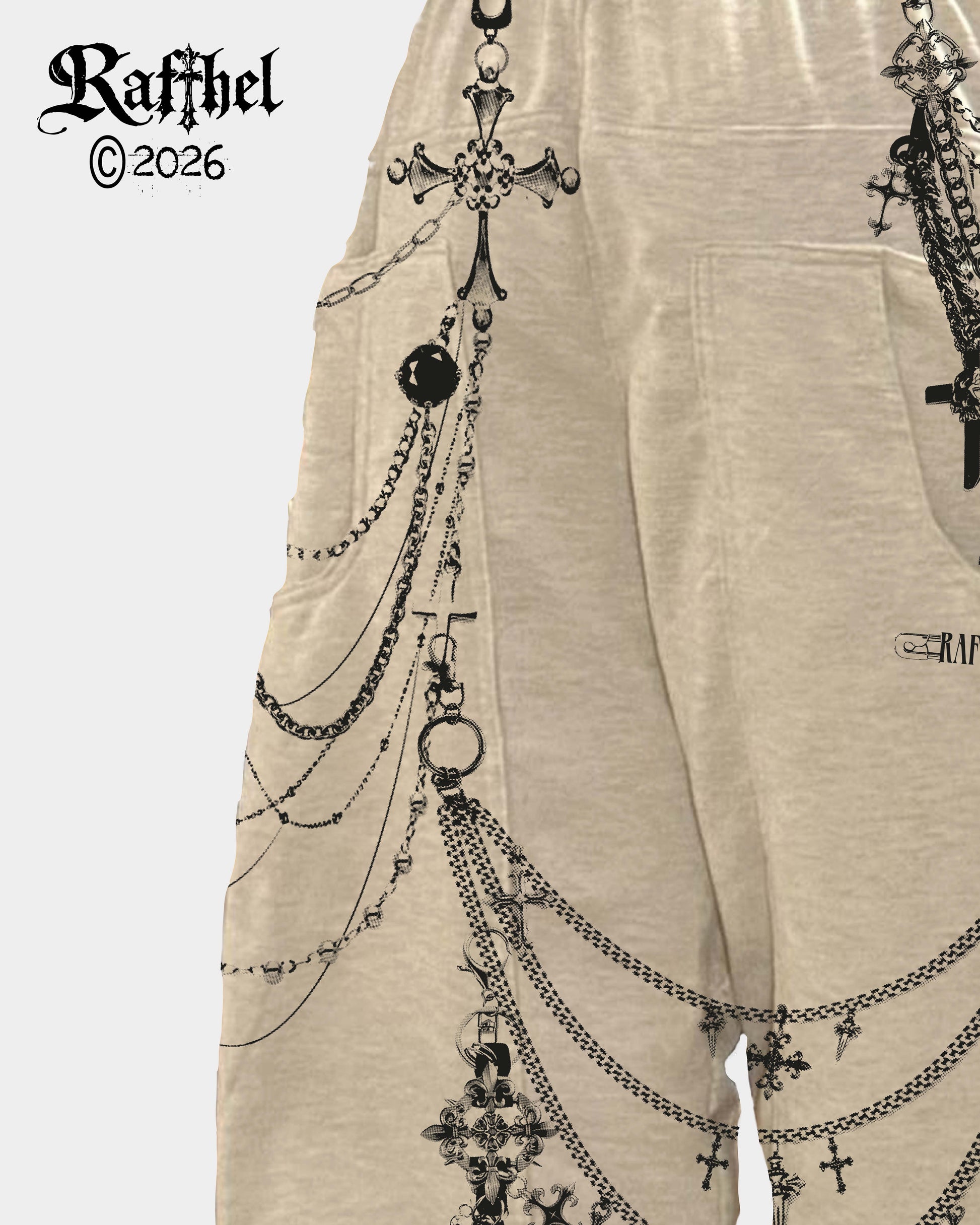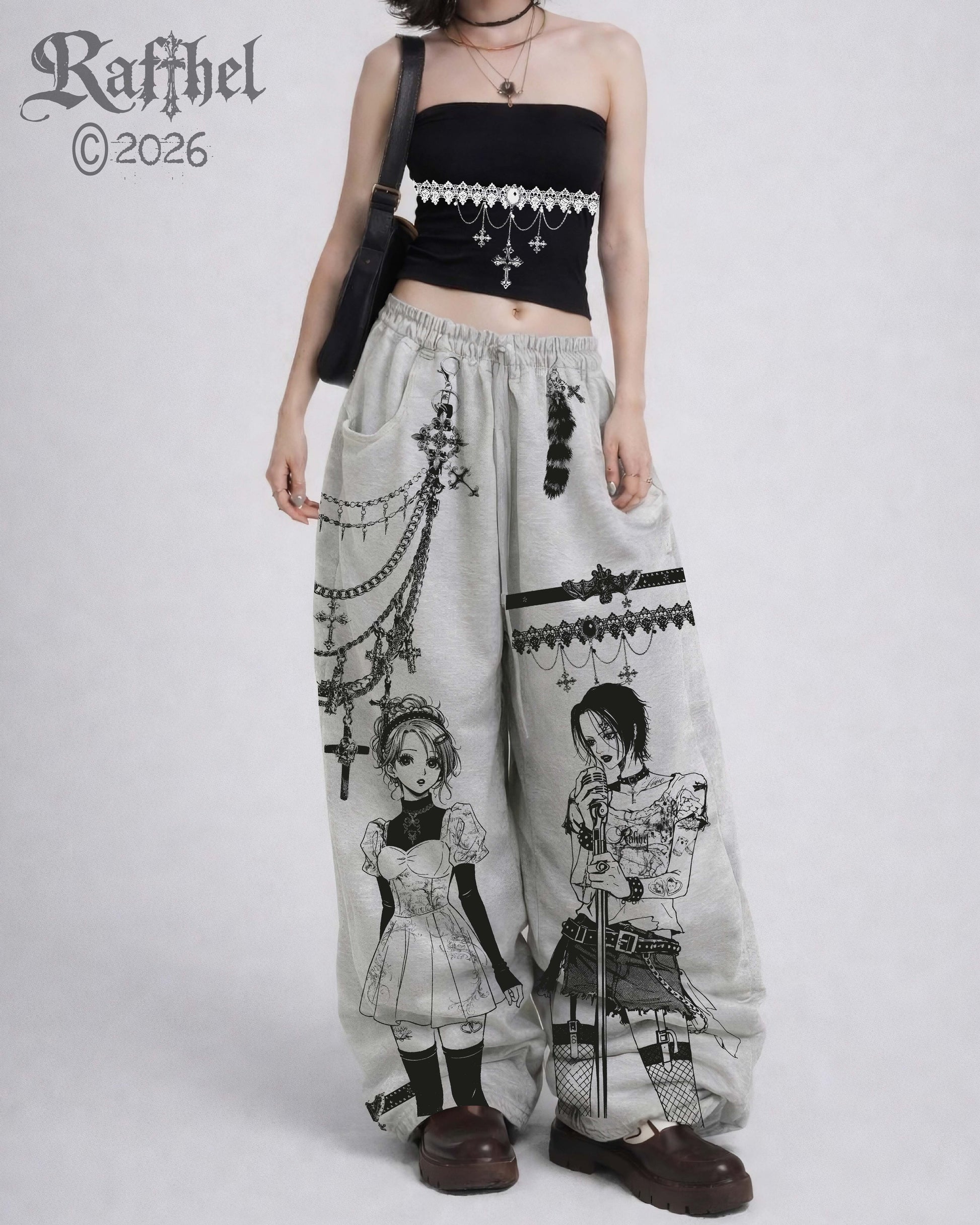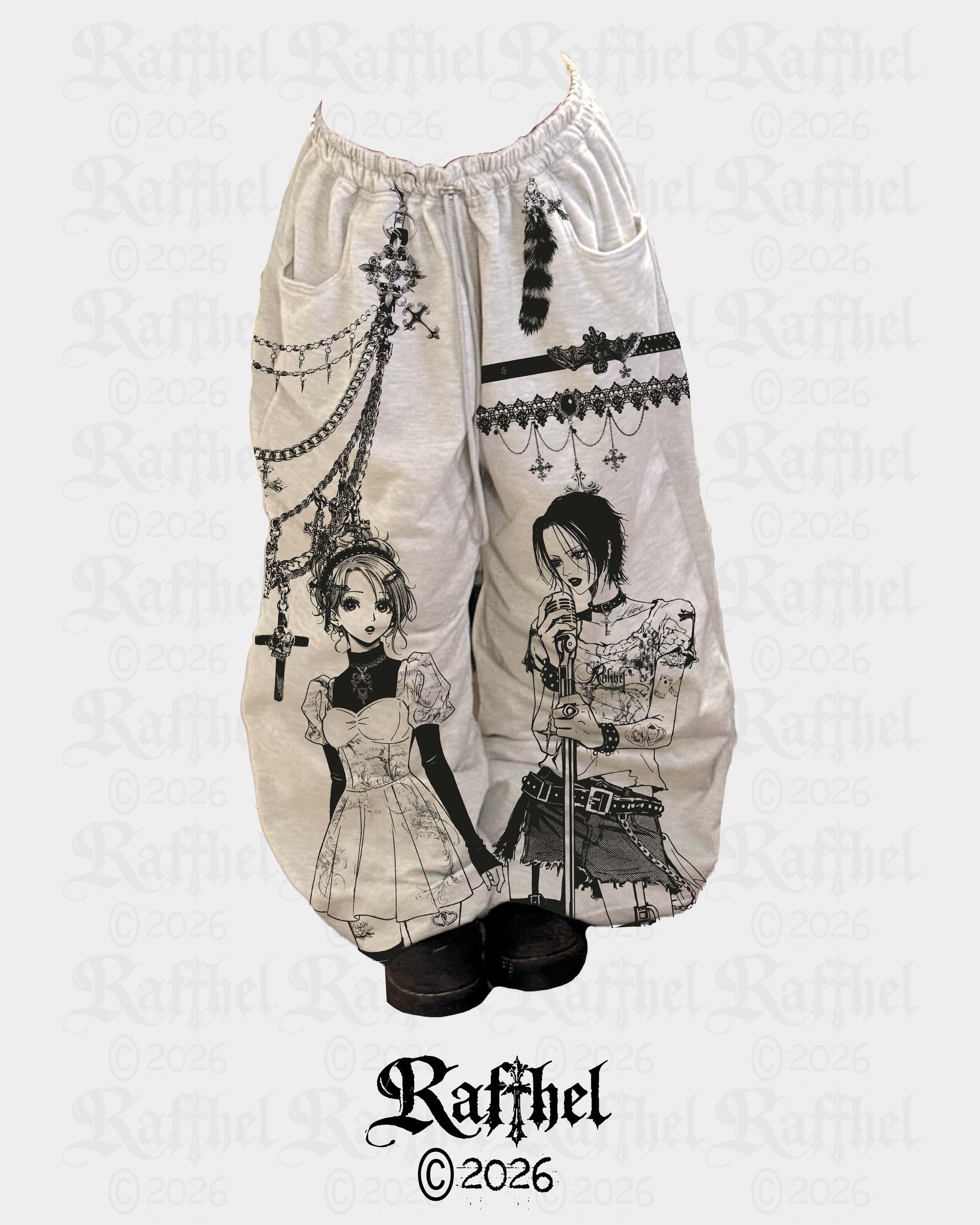 Chándal de bota ancha en tono gris melange inspirado en la estética punk japonesa y el universo visual de Nana. Su diseño integra cadenas ornamentales, cruces góticas y detalles ilustrados estilo manga que recorren la prenda de forma envolvente, creando una narrativa entre romanticismo oscuro y rebeldía urbana. Confeccionado en algodón perchado (50% algodón – 50% poliéster), ofrece estructura firme, interior suave y caída amplia oversized. Estampado en serigrafía tradicional; puede presentar ligeras variaciones o pintas de tinta que hacen parte de su carácter artístico y proceso manual.