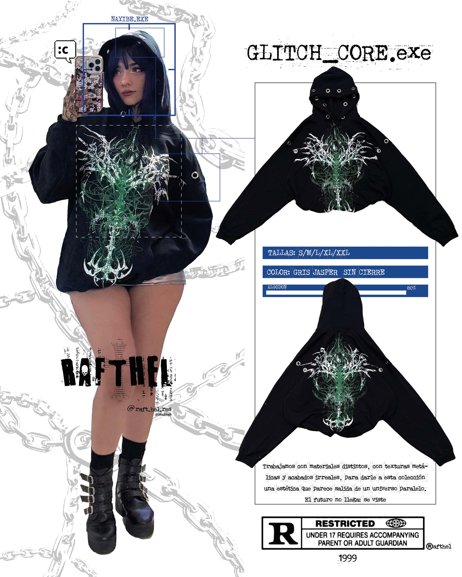 Hoodie 002 de Rafthel, inspirado en el universo visual del glitch core y la estética de Matrix. Su diseño se imprime en serigrafía tradicional, con ilustraciones exclusivas que evocan lo digital, lo caótico y lo futurista.
