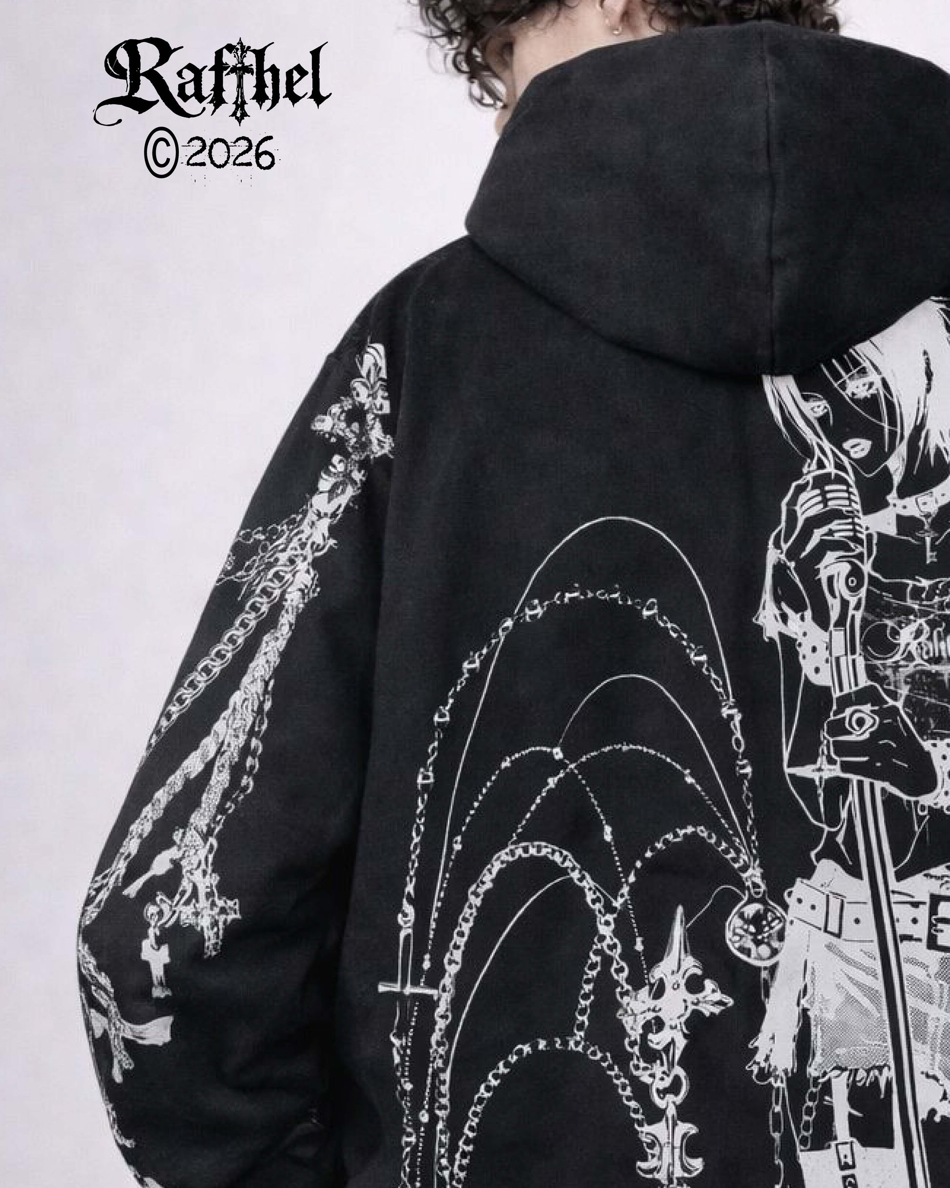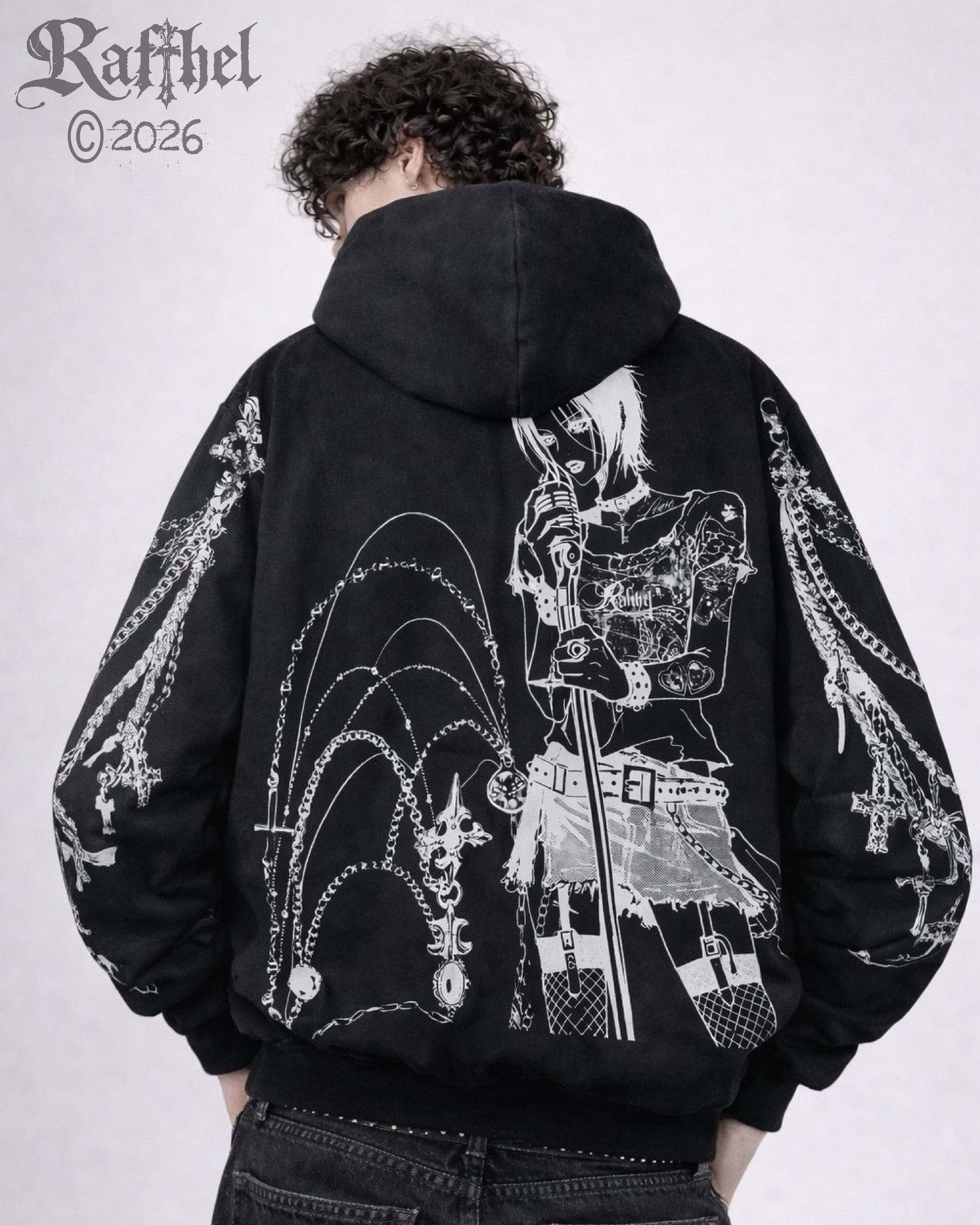 Hoodie negro inspirado en NANA OSAKI, adornado con cadenas realizadas en serigrafia dando contraste y fuerza